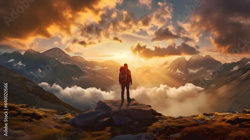 Mountain Retreat: Sunset's Warm Embrace Over Snowy Peaks Seen from Hiker's Back, generative ai
