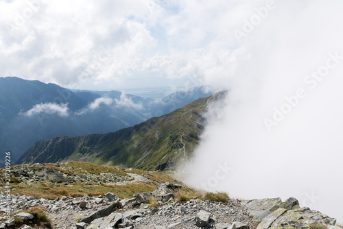 mountain, ridge, peak, hill, top, cover, half, partial, cloud, sky, storm, path, green, grass, nature, landscape, scenic, summer, light, trek, hiking, tour tourism, fog, dramatic, route, travel, view, rock, stone, slovakia