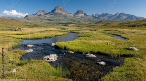 mountain, river, vale, landscape, nature, summer, sky, travel, scenic, photo, water, green, grass, hill, rock, view, beautiful, scenery, panorama, wild, wilderness, environment, clear, bright, day, calm, serene, peaceful, horizon, meadow, field, alpine, remote, explore, adventure, journey, discover, destination, vista, amazing, idylli