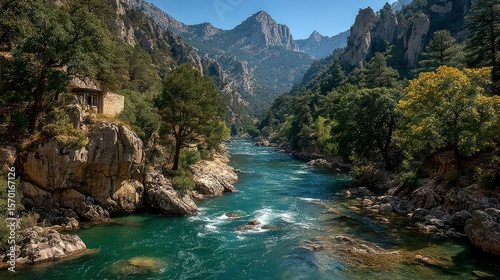 mountain, river, vale, water, tree, rock, sky, landscape, scenic, nature, green, blue, sunny, calm, forest, hiking, outdoors, view, gorge, sunlight, tranquil, adventure, picturesque, travel, tour tourism, exploration, wild, wood, forestry, canyon, panorama, stone, peak, cliff, fresh, flowing, serene, waterfall