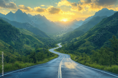Mountain Road at Sunset: Winding road through a picturesque mountain valley at sunset, bathed in golden light. A journey of exploration and scenic beauty.