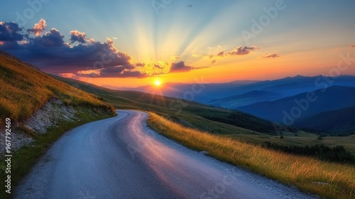 Mountain road at sunset, with dramatic colors and long shadows