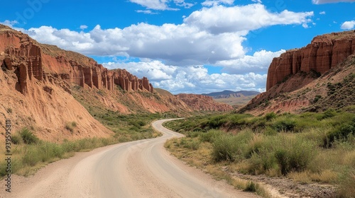 Mountain road in desert landscapes, winding under the sun, wilderness.