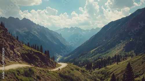 mountain, road, winding, path, peak, vale, tree, pine, conifer, forest, nature, landscape, scenic, view, sky, cloud, blue, sunlight, summer, travel, adventure, journey, elevation, altitude, high, infused, rocky, cliff, greenery, vegetation, wilderness, wild, serene, tranquil, calm, picturesque, majestic, awe, inspiring, breathtaking, beautiful, stunning