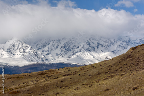 scenic, nature, sky, cloud, highland, mountain, landscape, plant, picturesque, background, outdoors, beautiful, view, vegetation, vale, hill, meadow, rock, slope, sparse, relief, sunny, spring, blue, snow, peak, white, glacier, brown, top, sunlight, altai, eat, horse, pasture, herd, foal, grazing