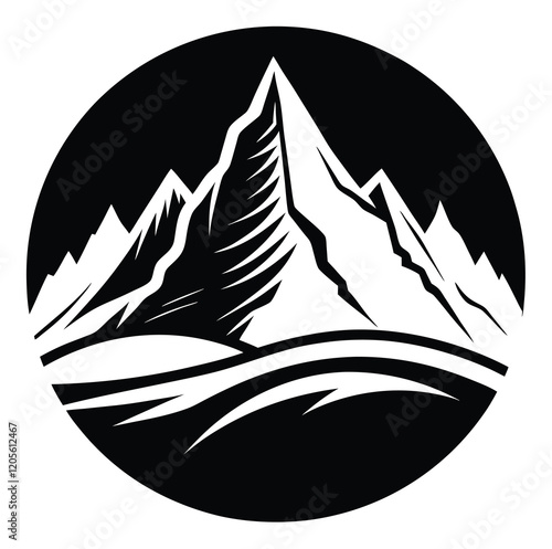 Mountain snow, river, and forest landscape scene logo silhouette illustration vector. clean, simple lines. black and white. for photo overlays t-shirt print flyer poster design.