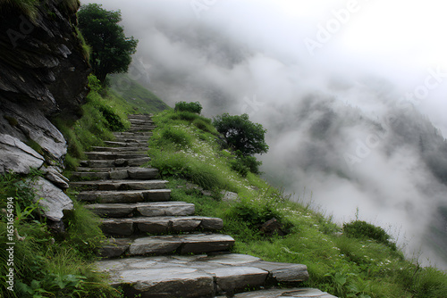 mountain, stair, step, pathway, trail, fog, mist, cloud, green, nature, landscape, hill, vale, outdoors, scenic, travel, adventure, hiking, remote, wilderness