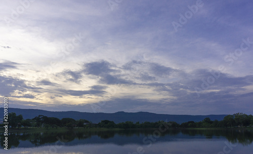Mountain Sunrise a lake on the front beautiful landscape with blue sky and cloud background, Panorama view..