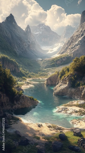 vale, river, mountain, nature, landscape, green, sunlight, cloud, scenic, beauty, calm, tranquil, water, rocky, foliage, travel, vacation, relaxation, peaceful, scenic view, adventure, forest, creek, stream, natural beauty, travel destination, environmental conservation, environmental protection, tour tourism, exploration, wild, hiking, trekking, photo, digital artwork, illustration