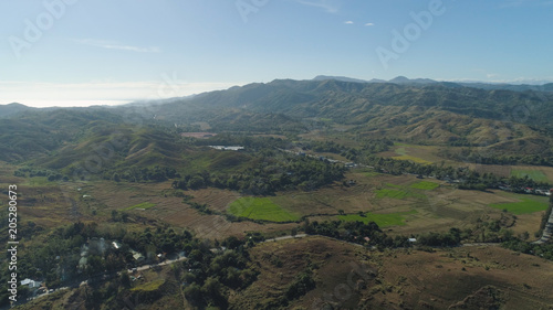 Mountain valley with village, farmland in the Philippines, Luzon. Aerial view: Mountain valley with green trees and river.