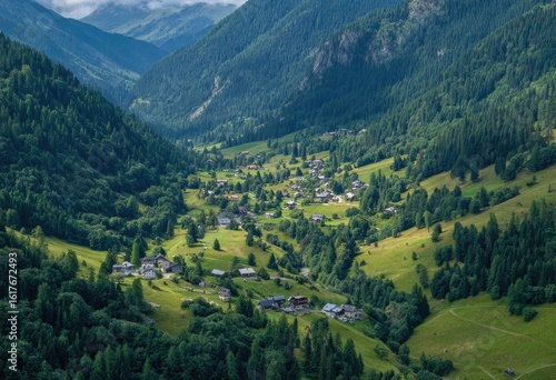 mountain, vale, village, green, lush, forest, tree, house, home, meadow, landscape, scenic, nature, alpine, beauty, picturesque, viewpoint, summit, peak, cloud, sky, cloudy, horizon, sunlight, shadow, rolling, hill, terrain, grassy, serene, tranquil, calm, elevated, huge, expansive, depth, perspective, photo, summer, cloudscape, building, rural