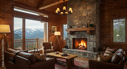 cabin, filed, living room, fireplace, stone, wood, mountain, view, window, cosy, comfortable, rustic, furniture, leather, sofa, chair, lamp, carpet, interior, home