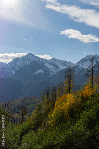 autumn, beautiful, blue, cable, cable car, caucasia, europa, forest, grass, green, hill, landscape, mountain, mountain, natural, nature, olympic, panorama, peak, resort, rosa, russia, scenic, season, ski, sky, sochi, tour tourism, transportation, travel, tree, vacation, vale, view, yellow