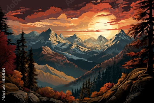contrast, dramatic, lighting, shadow, modelling, chiaroscuro, illustration, mountain, view, scenic, landscape, autumn, colours, majestic, peak, rugged, terrain, vibrant, hue, changing, light, dynamic, beauty, sense, of, serenity, awe, tranquil, grandeur, nature