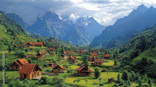 Mountain Village nestled among majestic peaks and verdant slopes