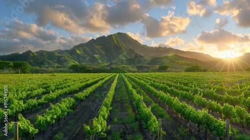 Mountain vineyard sunlit grape vines against majestic peaks in picturesque landscape