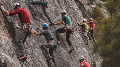 Mountaineering. Rocks. Rock climbing. Mountains. Mountaineers climb a rock. People with equipment overcome a difficult mountain route. Adventures. Tourism. Hiking with a backpack in the mountains.