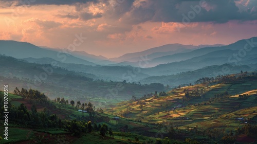 landscape, mountain, sunset, vale, hill, cloud, vibrant, colours, rural, agriculture, terraced, field, forest, nature, scenic, view, horizon, light, colours, mist, fog, elevation, green, brown, pink, orange, blue, red, gold, dramatic, peaceful, tranquil, beauty, outdoors, travel, photo, serene, explore, amazing, marvellously, picturesque, stunning, beautiful