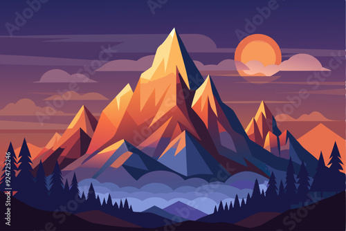 mountain, sunset, sky, cloud, mist, fog, peak, ridge, vale, horizon, dusk, twilight, nature, scenery, landscape, tree, forest, silhouette, hill, graphic, art, digital, illustration, design, abstract, geometric, shape, colours, vibrant, bright, dark, purple, orange, blue, yellow, green