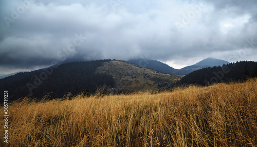 Mountains hills scenic view, autumn rural landscape with cloudy sky. Adventure, mountain hiking. Beautiful moody light. Travel concept. Panoramic view background