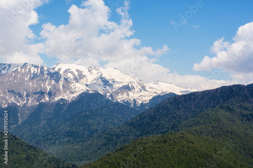 mountain, landscape, mountain, nature, sky, snow, view, blue, alps, cloud, summer, peak, forest, vale, panorama, travel, green, alpine, high, tree, hill, scenic, cloud, park, rock, mountain landscape, evening, sochi, resort, ski resort, vacation spot, sun ray