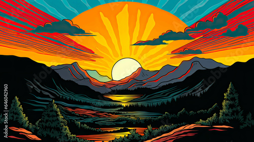 Mountains, Sunrise and river. Wanderlust or Hiking feeling in colorful art design with thick black outlining and strong colors. Logo or banner use.
