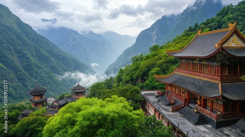 Mountaintop temples, lush greenery, misty valley.