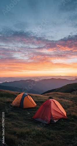 Mountaintop tents sunrise. Camping, landscape. Possible use travel, adventure