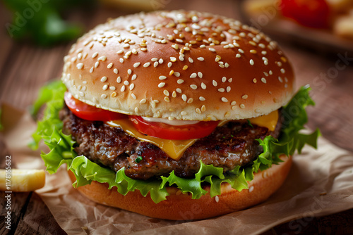 Mouth-Watering Classic Hamburger with Fresh Ingredients and Rustic Background
