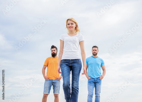 Moving forward support male team. What makes successful female leader. Girl leader qualities possess naturally. Leadership concept. Woman in front of men feel confident. Influential women leader