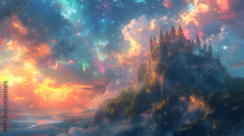 Märchenhaftes Schloss auf Bergspitze unter einem farbigen Himmel - KI generiert