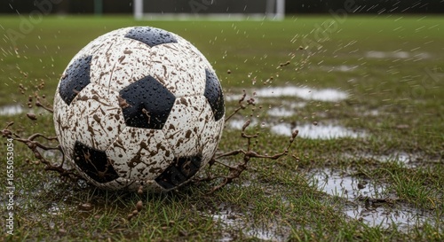 Muddy soccer ball on a wet grass field with splashing water