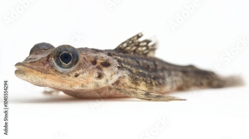 Mudskipper is visibly resting on smooth white surface highlighting its distinctive body shape and adaptations for both land and water environments typical of this species.