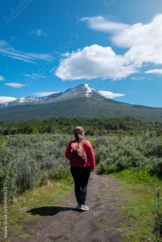 Mujer turista disfrutando de los senderos y recorriidos de El Chalten, en la Patagonia Argentina