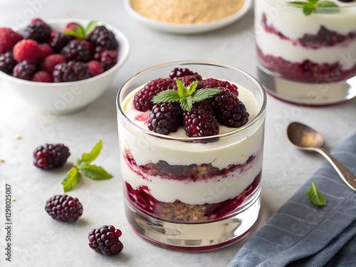 mulberry Yogurt Parfait in Glass with Whipped Cream and Fresh Berries – Healthy Breakfast or Dessert