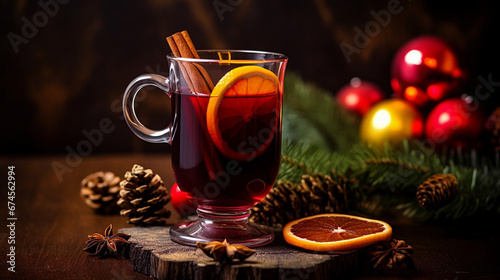 Mulled wine in a transparent glass on the background of a Christmas tree. New Year background.