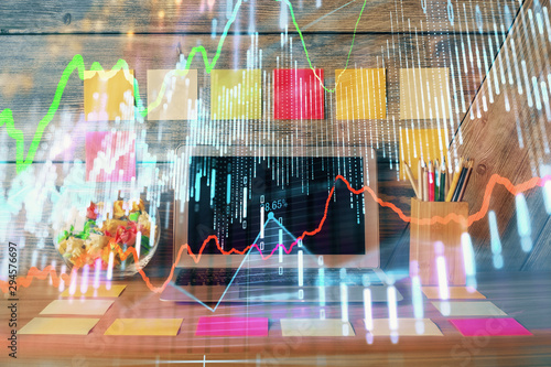 Multi exposure of chart and financial info and work space with computer background. Concept of international online trading.