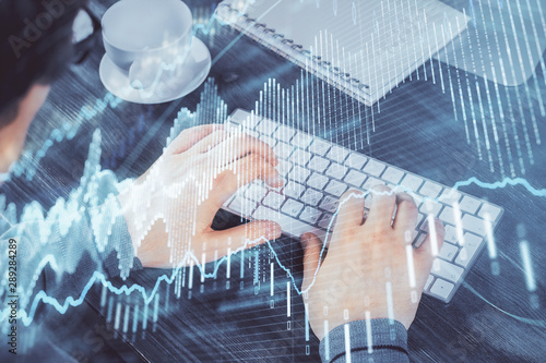 Multi exposure of graph with man typing on computer in office on background. Concept of hard work.