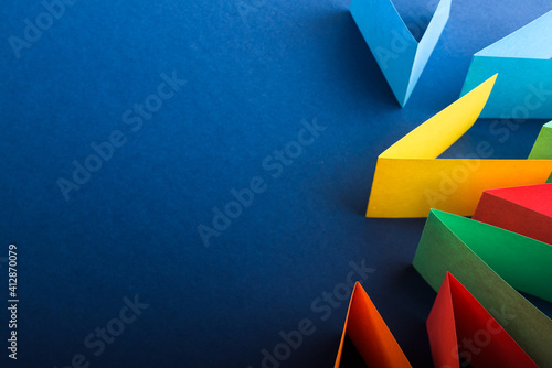 Multicolored cut paper on blue. Abstract arrows, direction signs.