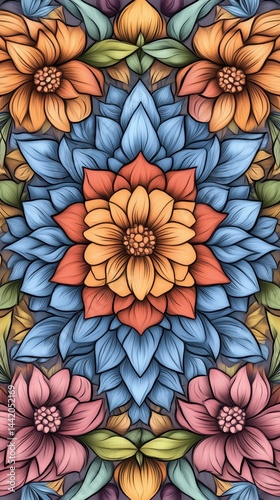 Multicolored floral pattern; symmetrical, detailed design.