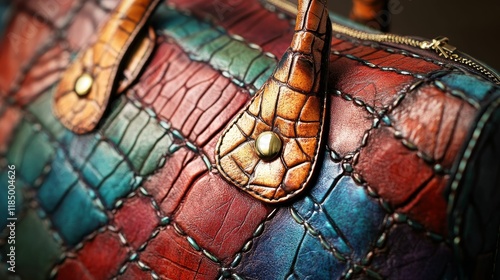 leather, pursed, texture, stitching, detail, craftsmanship, many-coloured, patchwork, ornate, exotic, reptile, scale, gold, hardware, buttons, zip, closeup, fashion, accessory, luxury, vintage, style, elegant, hand-made, artisan, premium, glossy, colourful, pattern