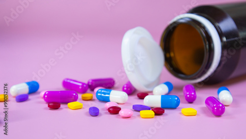 Multi-colored pills, capsules used in medical treatment are scattered on a pink background. Colorful pills, capsules and brown medicine bottle. Healthcare and medical concept. Space for text.