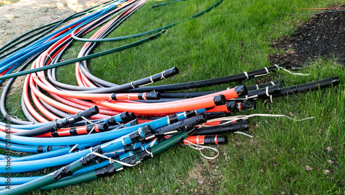 Multicolored Plastic channels for fiber optic cables. Laying and horizontal drilling.