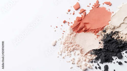 Multicolored scattered cosmetic pigments on white background. Concept of makeup, beauty industry and aesthetic compositions.