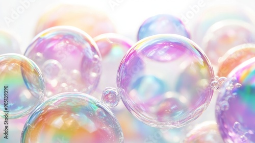 Multicolored soap bubbles on a white background, featuring bright and reflective surfaces.