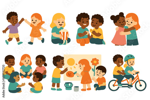Multicultural Kids' Fun. Flat vector mini-illustrations multicultural friendships in colors children's