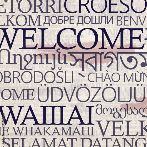 Multinational stand with word welcome in different languages