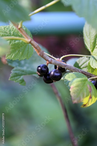 Multiple blackcurrant berries growing in bush located in a backyard of a Finnish summer cottage. Healthy and fresh berries full of vitamin c & other antioxidants. Can be eaten fresh or used for baking