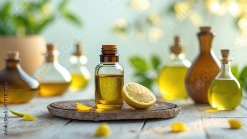Multiple bottles of essential oils with lemon slices on a rustic wooden surface. Aromatherapy and natural remedies. Essential oils and wellness. The concept of aromatherapy and natural health