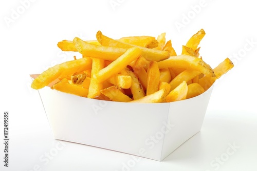 Multiple French fries in white box on white background.